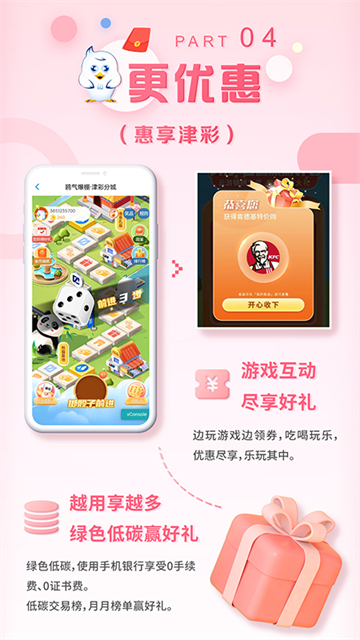 为您打造手机银行专属理财产品,还有基金、天天宝、通知存款、日增利等多种服务供您选择。生活频道专享优惠活动为您带来精彩的消费体验。