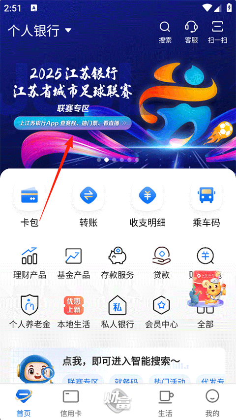 1、打开并登录江苏银行手机客户端,点击首页的2025江苏银行江苏省城市足球联赛专区活动,进入后需先完成实名认证;