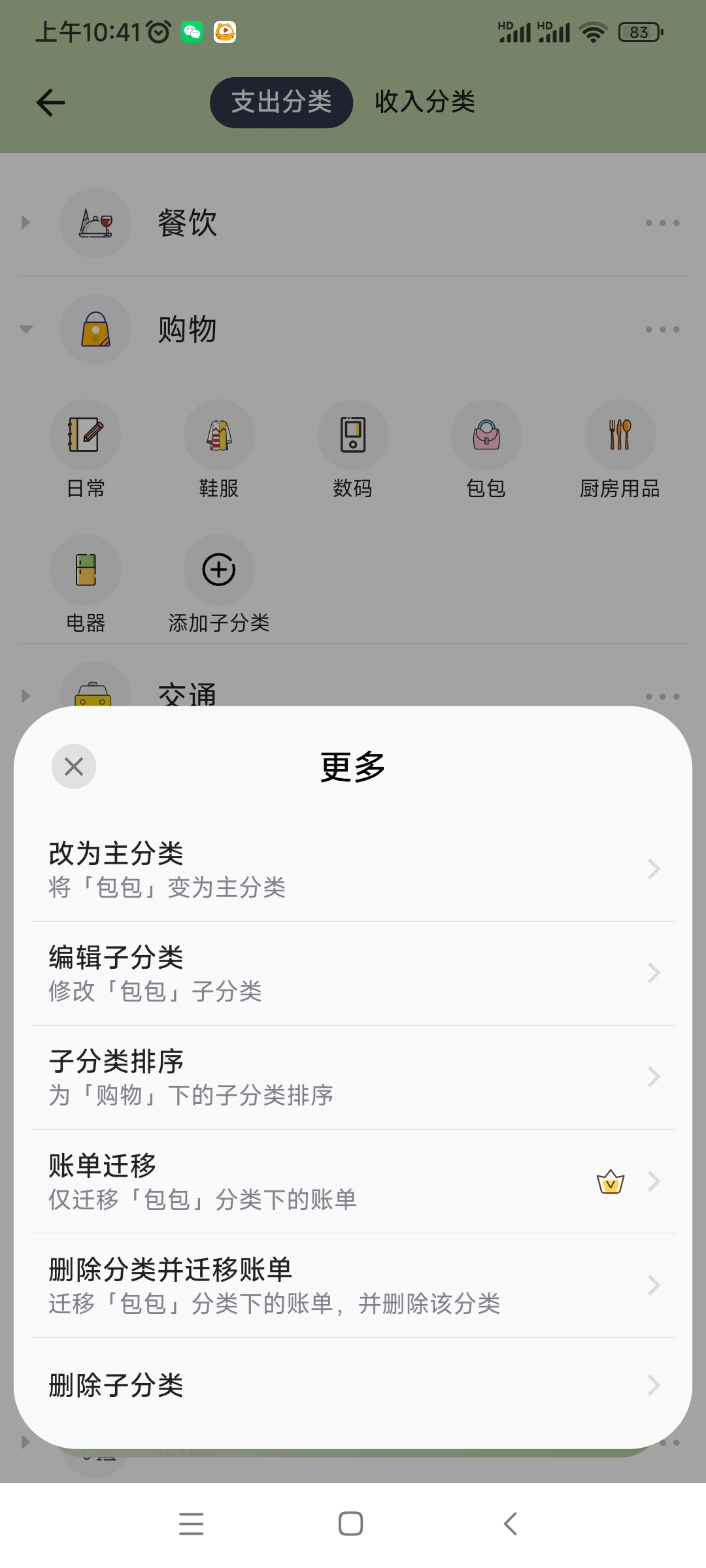 1、在下方我的菜单里选择“收支分类”,点击右边三个点,即可删除分类。