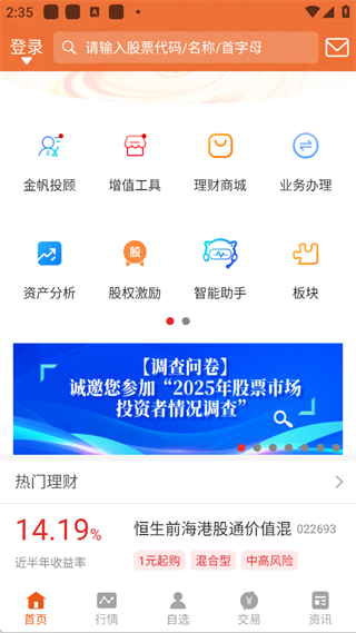 集成金帆投顾、增值工具等核心功能入口,顶部有搜索栏下方为热门理财产品推荐。