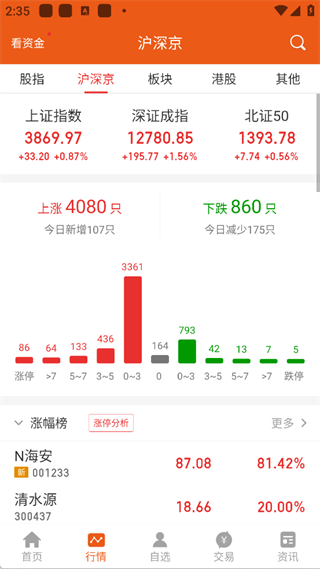 展示市场指数实时数据,包含涨跌家数统计及柱状图分布,下方有涨幅榜和涨停分析等内容。
