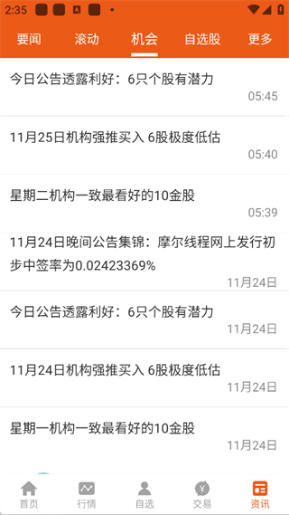 设有要闻、滚动、机会等栏目,呈现机构推荐、公告解读等财经资讯,支持按自选股筛选相关内容。