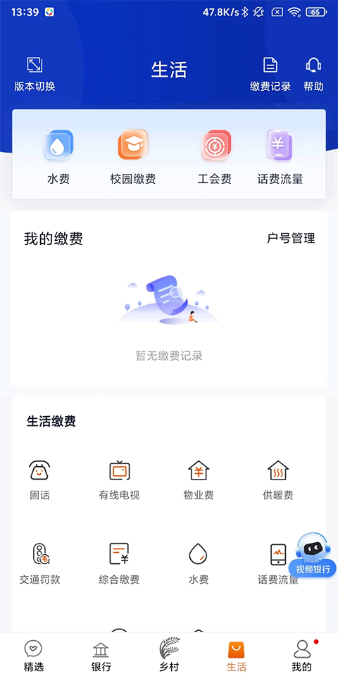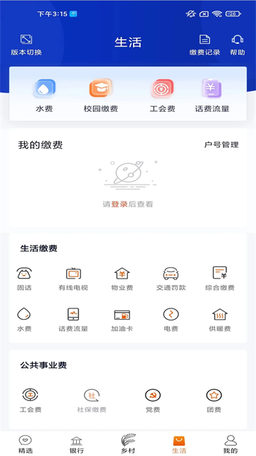 4、生活:水费、工会费、话费流量、校园等生活缴费服务入口。