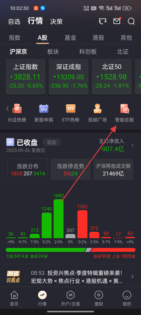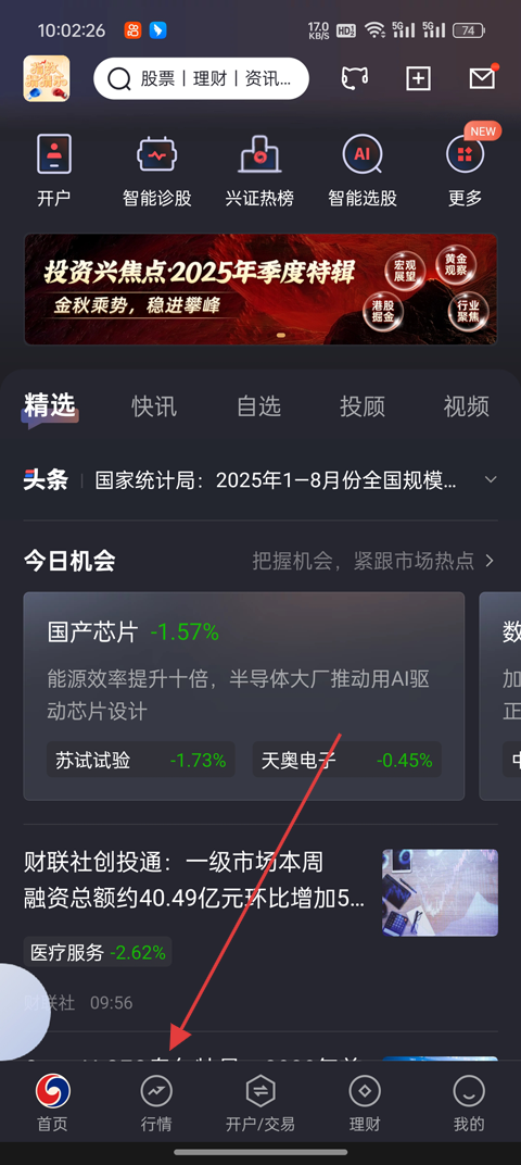 1、打开兴业证券优理宝App,在底部菜单栏中点击【行情】;