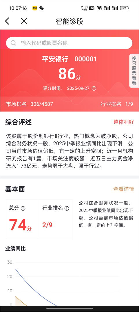 4、系统会自动生成诊断结果,你即可查看该股票的评分及相关详情。