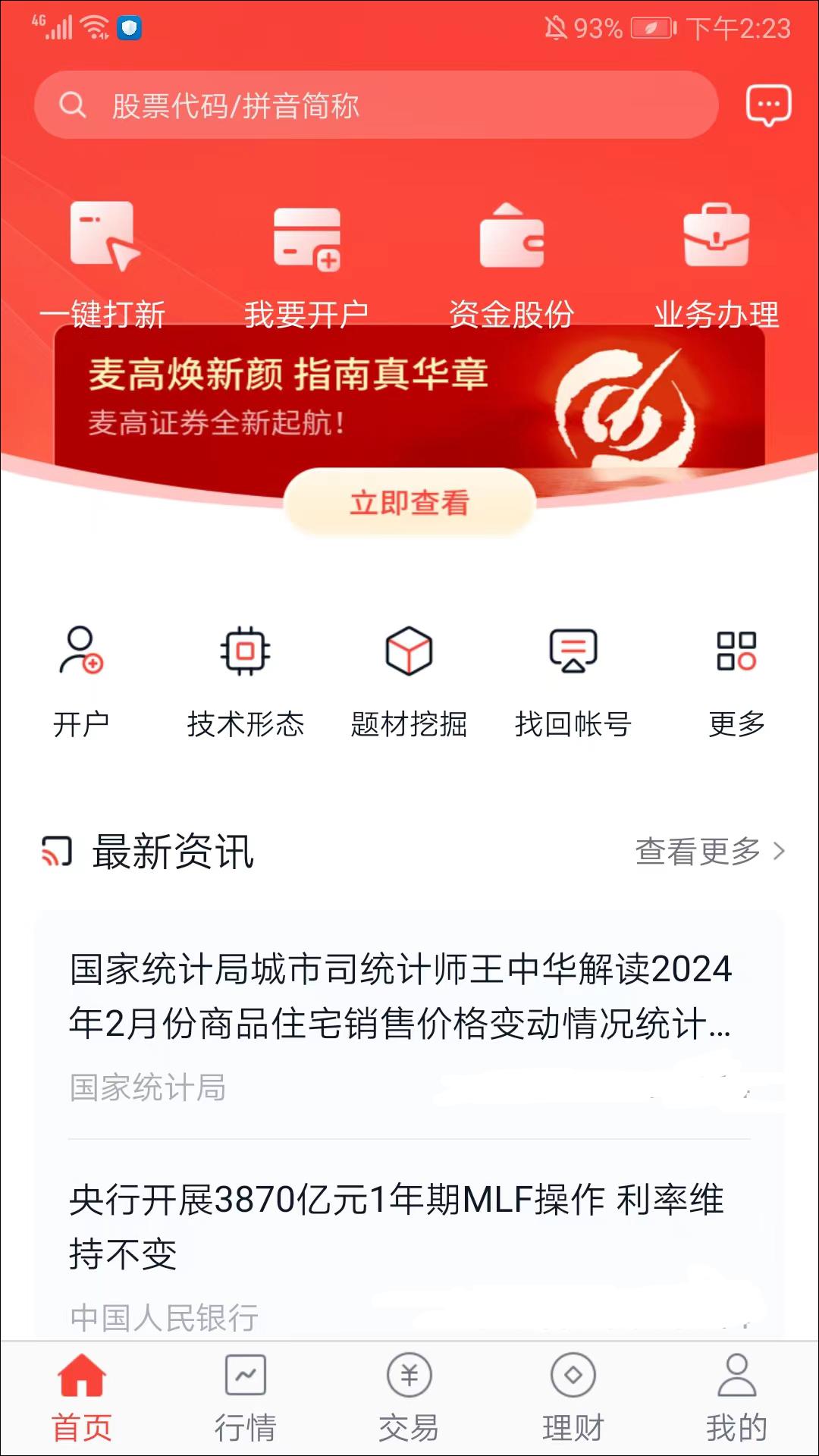 1、打开麦高证券APP,进入应用,可看到包括首页、行情、交易、理财和我的栏目,在首页界面用户可根据需求选择使用一键打新、我要开户、业务办理和资金股份等功能。