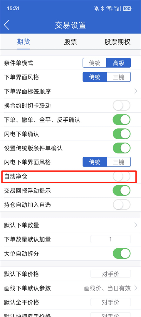 2、点击【交易设置】,然后打开【自动净仓】即可