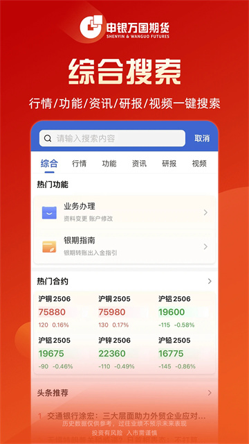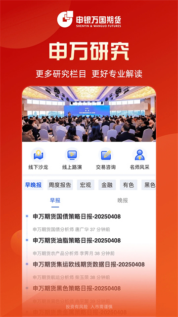 申万期货App是一款线上投资理财软件,提供期货线上业务办理,包括股指期货、原油期货、研报、咨询、期货仿真交易和期货交易软件等,为用户带来专业的理财服务。在这里你可以学习到许多期货相关知识,可以浏览最新最热的期货资讯,及时了解市场行情,软件还会提供投资研报,多维度分析大盘走向,申万期货是你投资必不可少的智能助手,有需要的朋友欢迎下载体验。