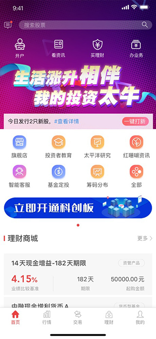 v5.5.0太牛证券app是由太平洋证券推出的一款集股票行情、交易、理财、服务、业务办理、开户功能于一体的新一代互联网理财投资软件, 隆重推出了稳赢理财、热搜股票、自选股云同步,推荐好友等功能,使投资更简单,服务更贴心。软件集合了市场行情分析在线交易两大功能为一体,提供专业的资产分析功能,为用户推荐制定安全性较高的理财方案,交易动态实时查看,体现到账无需等待!此外该软件在理财服务上也是十分的贴心,提供全天候的智能客服,有什么问题都可以在线沟通并解决,还带来了多种多样的理财产品,定期、活期、基金随你购买,享受更加轻松的投资体验。太牛证券给用户提供最新的理财投资信息,让你精准投资,获得更高收益。别再等待,有需要的用户快来下载体验吧!