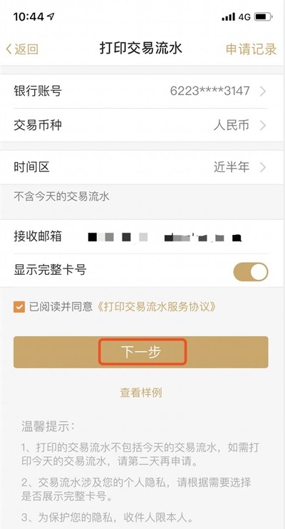 3.选择银行账户、交易币种、时间区,填写接收邮箱(仅限本人邮箱)