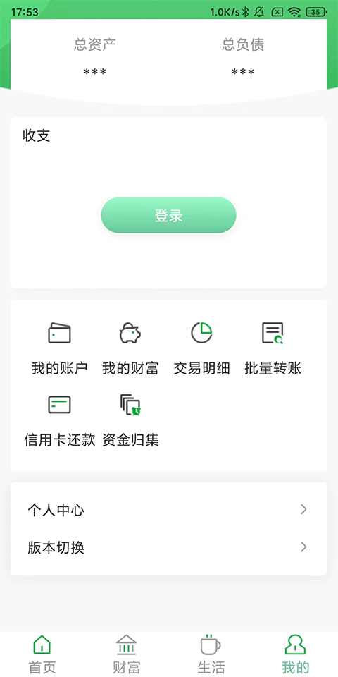 3、我的:我的账户、我的财富、交易明细、批量转账、信用卡还款以及资金归集等;