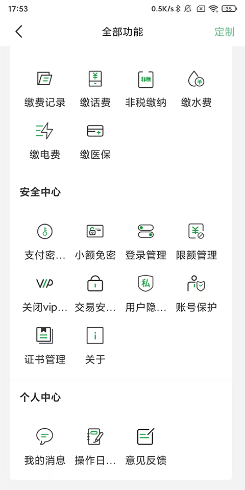 4、全部功能:涵盖转账汇款、生活缴费、安全中心以及个人中心所有服务功能。