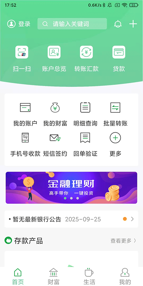 1、首页:提供扫一扫、账户总览、转账汇款、贷款等常用主要功能快捷入口;