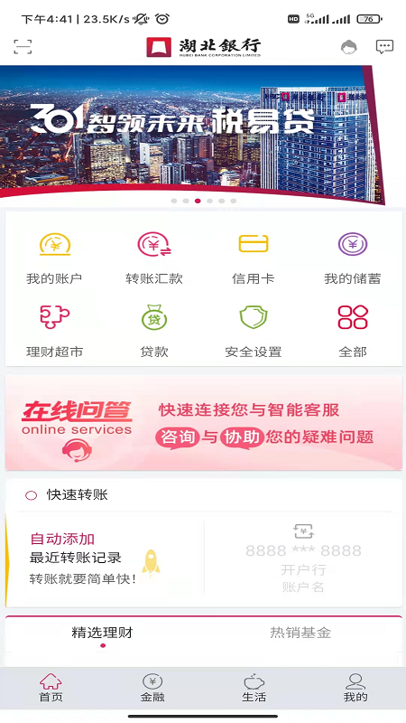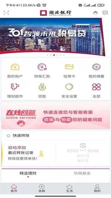 v2.1.50湖北银行app是专为旗下客户打造的一款手机银行客户端,致力于为客户提供多种功能、方便、安全的全方位移动互联网服务窗口。软件设有余额查询、明细查询、账户挂失、密码修改、行内转账、跨行转账、预约转账,在线缴纳水费、电信费、定期活期互转、智能通知存款办理、理财产品购买、查询个人贷款等多项实用功能,让用户足不出户就能轻松办理业务。