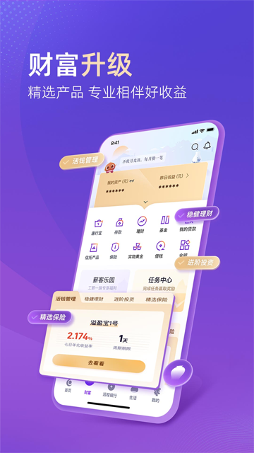 “投资理财”服务,同样能够获得高于柜台渠道的收益,又免去了排队等待之苦,更能够先人一步抢到爆款理财产品。