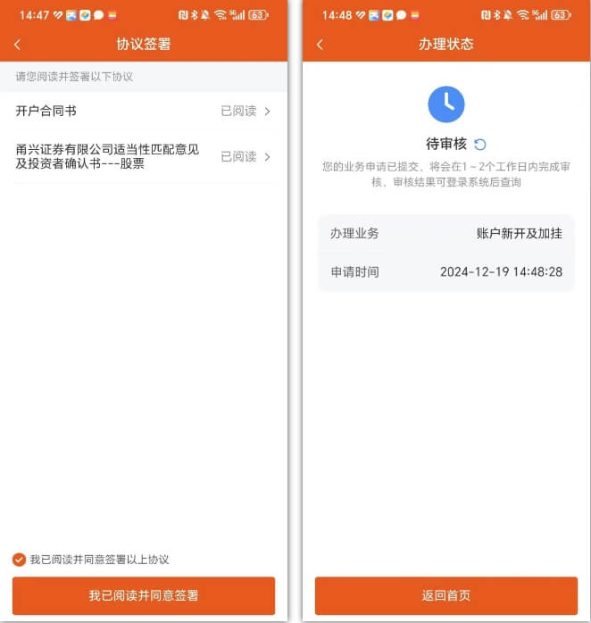 4. 需签署《开户合同书》与《甬兴证券有限公司适当性匹配意见及投资者确认书--股票》,签署完成后等待审核即可。
