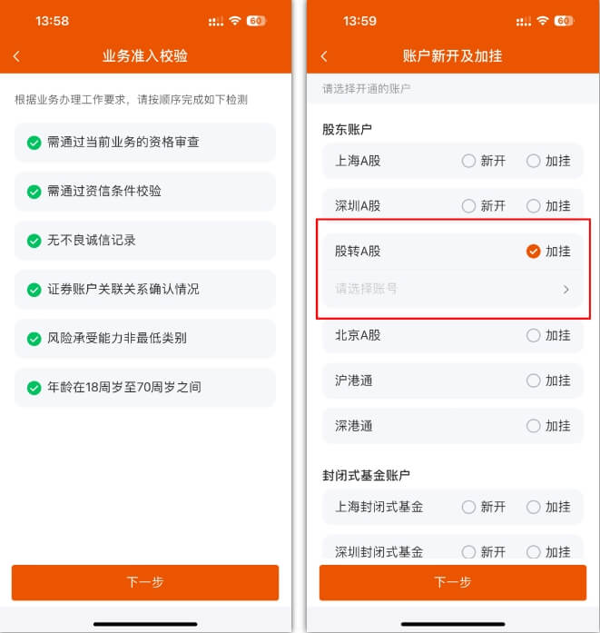 2.通过业务准入校验后,选择“股转A股”,选择账户,通过适当性匹配后,即可进行业务开通。