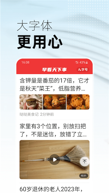 早看天下事app是一款非常不错的新闻资讯阅读软件,海量的新闻资讯消息实时更新,并根据不同的类型进行分类整理,你喜欢什么样的新闻都能很容易找到。早看天下事app首页还会进行个性化的推送,保证都是一些你会感兴趣的新闻内容,除此之外软件采用了比其他新闻软件更大的显示字体,还有多种字体样式可以设置,可以让你获得更好跟更好的阅读体验的同时也能保护眼睛。此外,在这里你还可以与其他网友进行沟通互动,一起讨论新闻观点,非常便捷有趣,快来定制你的独家新闻信息,头条更懂你。