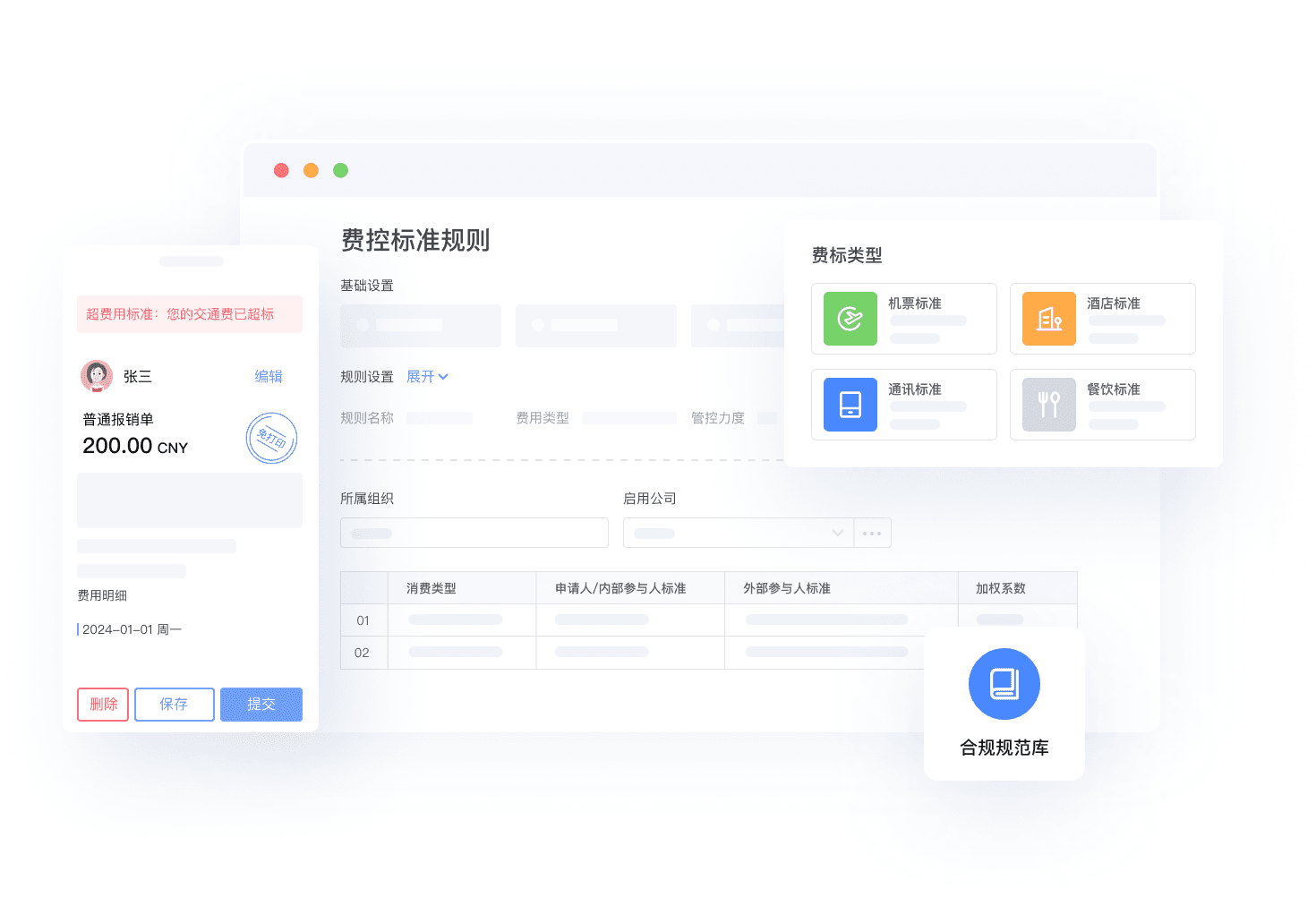 ●后台维护标准以及合规规范,在业务发生费用、记录费用、申请费用以及提报费用时系统自动进行合规检查,告知前端业务,前置合规监管。
