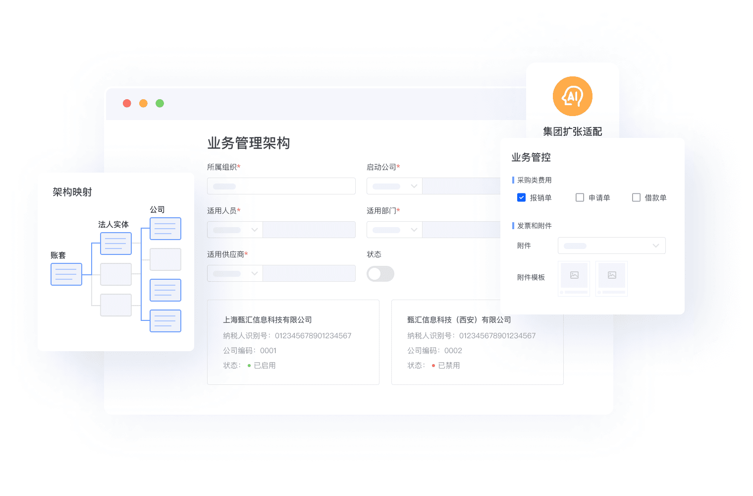 ●为帮助客户快速应对市场变化,汇联易支持在财务核算架构和人事行政架构之外建立业务管理架构,这三者相互映射,既能满足业务变化的需求,又能满足公司治理的需求;