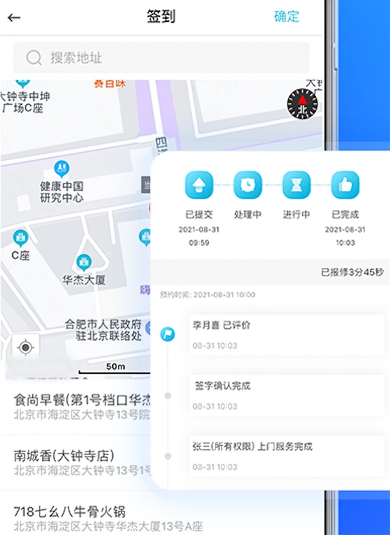 服务进度实时追踪、多方可视,现场地图签到,快速定位
