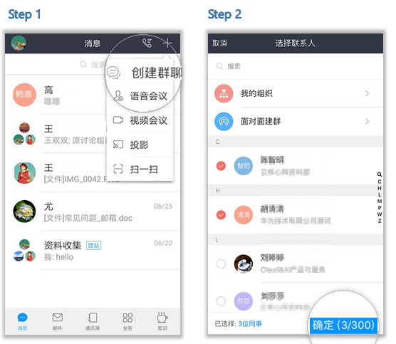 消息、邮件、群组、云空间、音视频等协作方式融合;