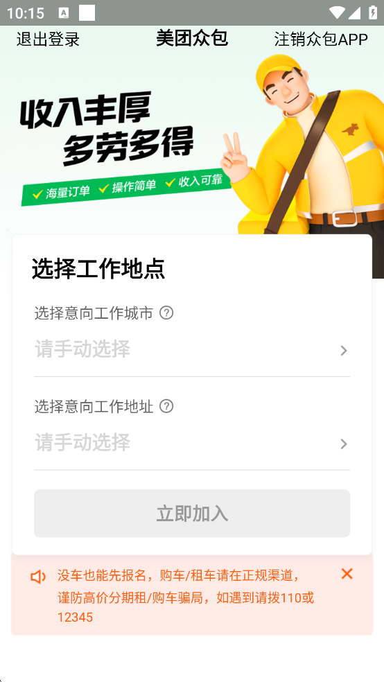 v12.9.5.7300美团众包骑手app是一款专门为兼职人群打造的专业配送接单赚钱软件,用户可以自行注册跑单,不需要缴纳任何费用。软件依托于美团外卖,每天有超过4000万配送订单等您配送,更有多重活动,对兼职及送餐助力!美团众包骑手app长期保持兼职专职骑手招聘活动,注册即可开始进行配送兼职工作,单单结算,让您随时随地开赚,自我掌控时间!