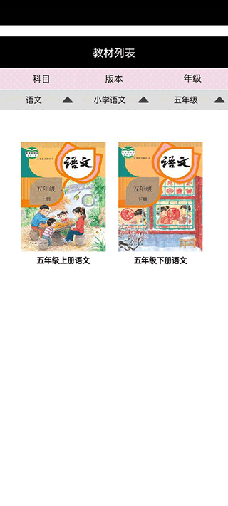 1、打开软件选择自己想要学习的课本,有人教版五年级语文上册和下册可供选择;