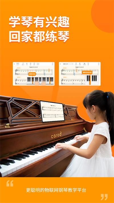 云上钢琴学生端App是为琴童和家庭量身打造的智能学琴工具,配套卡罗德物联网真钢琴使用,全面支持钢琴学习的线上线下融合。通过云上钢琴学生端App,学生可进行在线课程学习、作业提交、练习数据记录、进度反馈等,形成完整的音乐成长档案,提升学习效率。App特别适配当前教育需求,简化老师教学流程的同时,也为家长提供了“透明可视”的监管工具。系统支持实时练琴数据同步、智能评分、错音识别、课程回放等功能,真正让钢琴学习告别“费时低效”的老模式,向“高效沉浸式”转型。