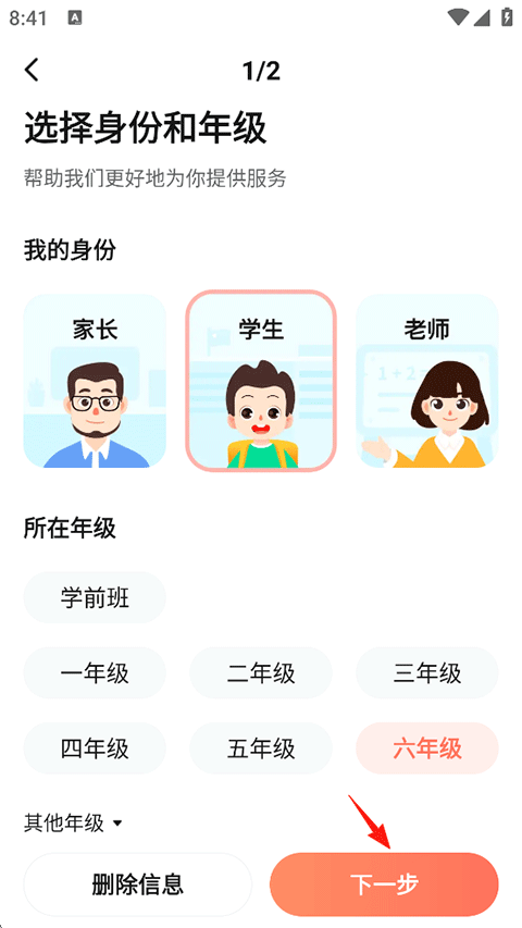 3、下方选择您需要更改的年级,也可以更改身份,然后点击下一步。