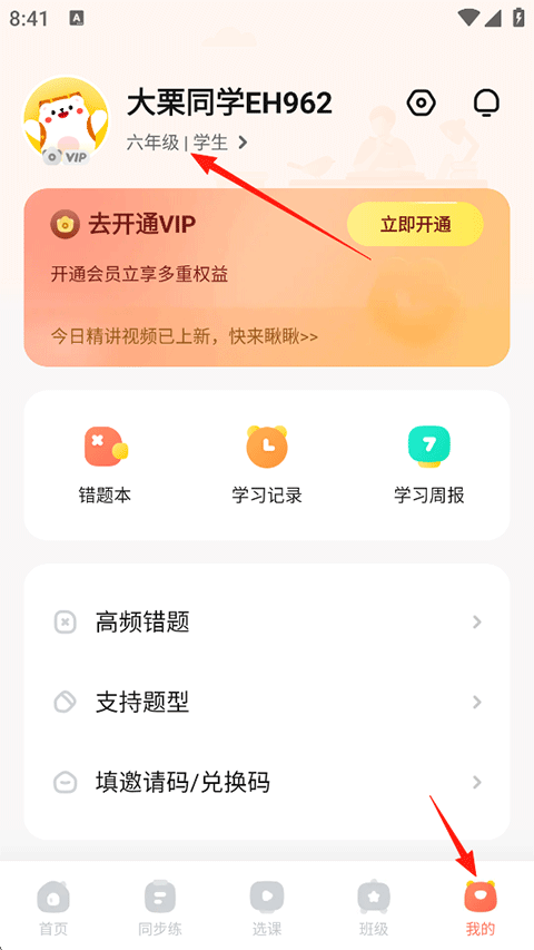 1、打开作业帮口算APP,点击我的-昵称下的年级|身份进入个人资料页面。