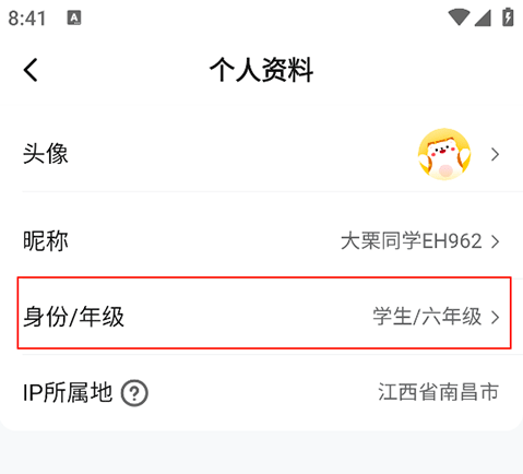 2、在个人资料页面点击下方的身份/年级。