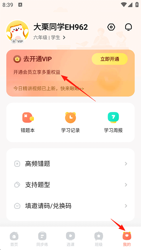 1、打开作业帮口算APP,点击我的-VIP功能。