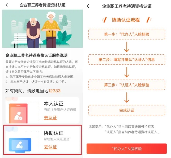 3.请按图示完成相关步骤,当页面显示“认证成功”后才算完成认证。认证结束后,在皖事通消息版块可查收认证成功的消息提醒