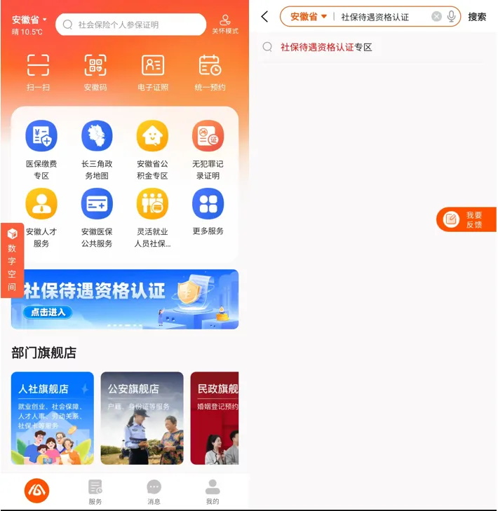 1.下载“皖事通”APP并注册登录,在首页搜索栏中搜索“安徽省公积金专区”,点击进入专区。