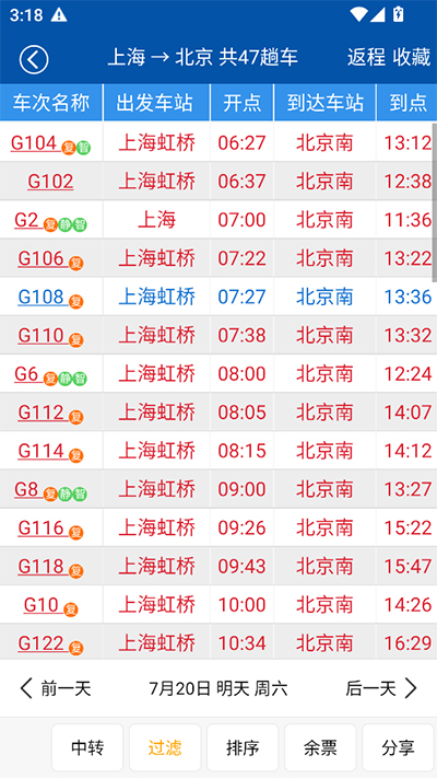2、在结果展示界面,点击出现的结果页面,然后将会打开详细的车次信息。