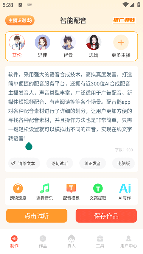 1、打开配音鹅APP,粘贴一段需要配音的文案,上方选择主播配音,点击下方的试听,满意的话点击保存作品;