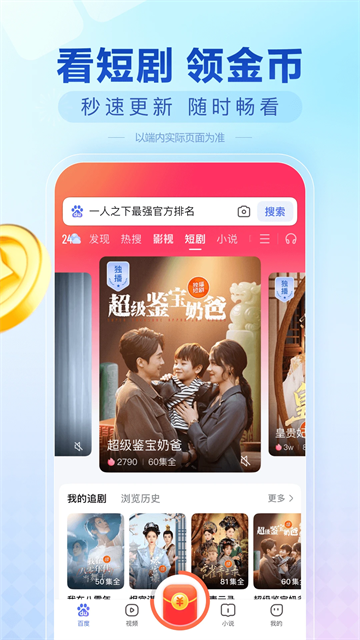 v6.84.0.10百度极速版是一款兼具搜索引擎功能的同时还能赚钱的软件,此版本体积更小,占内存少,使用起来也更加流畅。而其最大的特点是增加了赚钱功能,用户可以通过做游戏、刷视频、签到、搜索、邀好友、阅读文章等任务来赚取金币,而赚取的金币将会以1:10000的兑换比例进行现金提现至微信和支付宝中。此外,百度极速版保留了原版百度的基本搜索功能,并且其搜索、浏览的速度也比原版更加的流畅,为的就是可以让用户有着良好的使用体验!同时其中还汇聚了海量的新闻、热点资讯、明星动态、动漫小说等超多的丰富内容,让你只要打开软件就可以随时随地的了解许多从未见过的知识。