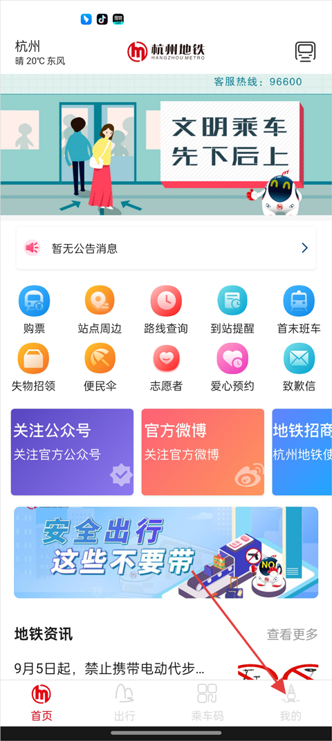 1、打开杭州地铁App,点击右下角的【我的】进入个人中心界面。