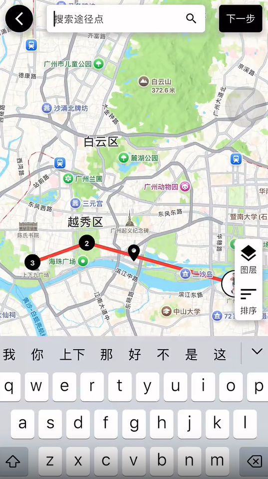 设置终点,生成导航路线,地图自动巡航,沿路线实时移动。