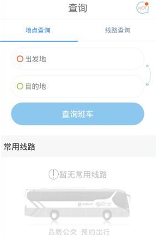 1、打开软件,在查询界面,有着地点查询和路线查询,输入出发地和目的地可以查询班车或是直接输入路线编号精心查询;
