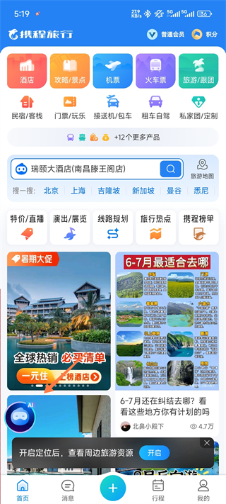 1、携程旅行网App,在首页可以看到内置AI功能,点击