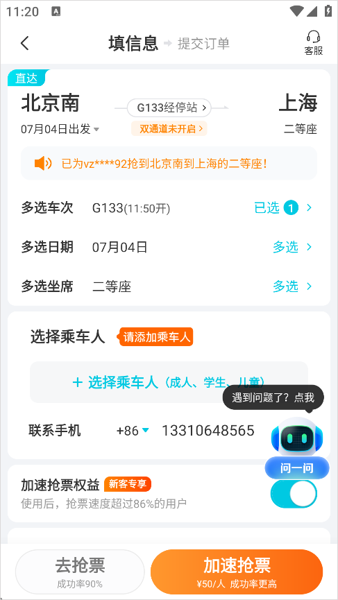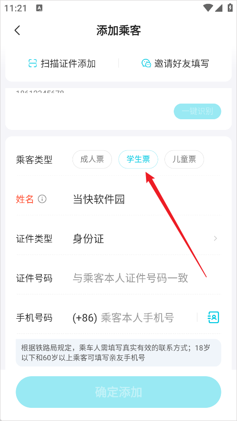 6、在车票页面点击添加乘客。