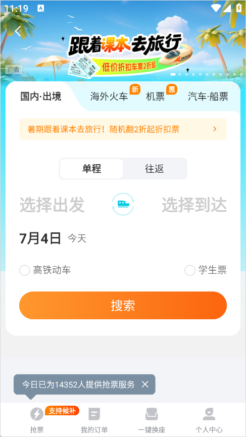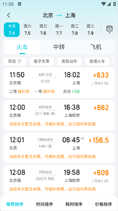4、点击搜索选择合适时间的车票。