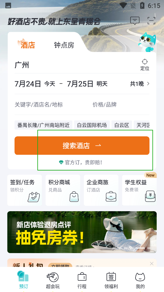 1、打开东呈青猫会酒店预订软件,点击搜索酒店