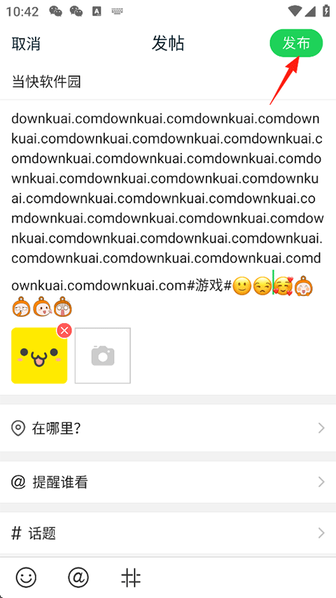 3、在输入框输入您想表达的内容,可以添加图片、表情和话题以及@他人,完成后点击右上角的发布;