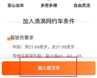4、进去加入滴滴网约车司机之后,选择城市,点击加入,这里可以看一下加入的条件;