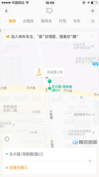 2、进入主页面,输入用户所在地址(一般系统会自动定位)和目的地,点击在这里上车,即可在线约车;