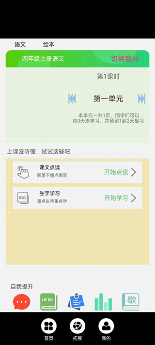四年级语文上册人教版app是专为四年级学生量身打造的一款人教版语文电子课本,它可以帮助你提前预习课本,还能够朗读课本,家长们可以直接让孩子跟读学习新课,还能提前了解生字词,纠正发音问题。此外,四年级语文上册人教版里还有数不清的故事绘本,在孩子学习累了的时候,还能点开绘本看童话故事,简直是学习娱乐两不误呀。