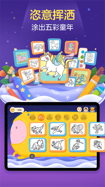 根据儿童的兴趣点,有针对性的提供各种风格的涂鸦角色,鼓励孩子从海量涂色游戏中选其所爱,进行大胆的色彩试验;